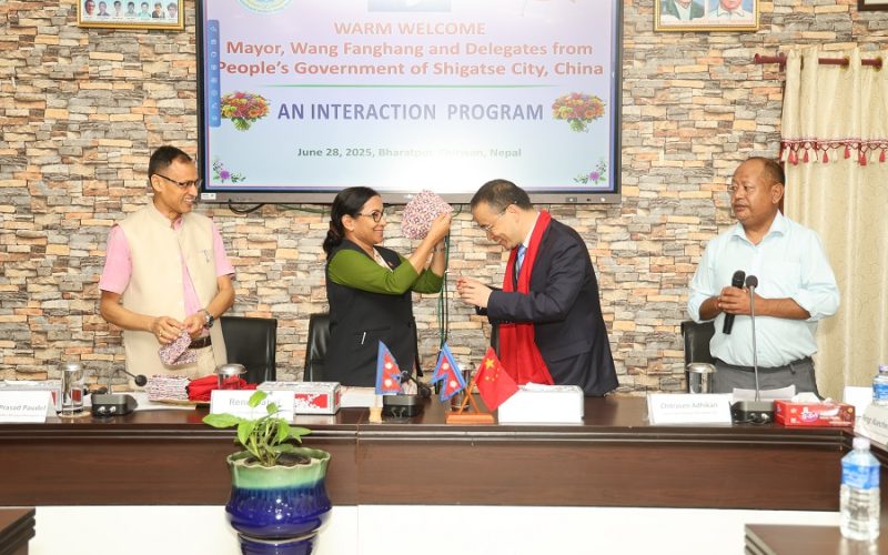 भरतपुर, असार १४- चीनको सिगात्से सहरका मेयर वाड्ग फड्ग हुड्ग भ्रमण टोली शनिबार भरतपुर आइपुगेको छ । भरतपुरको भगिनी सम्बन्ध रहेको सिगात्से सहरका मेयरसहितको टोलीलाई भरतपुर महानगर प्रमुख रेनु दाहालले कार्यालयमा स्वागत गर्नुभयो ।
