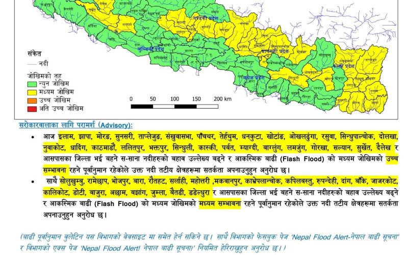 जल तथा मौसम पूर्वानुमान महाशाखाको ‘Flash Flood Bulletin’ अनुसार देशका केही स्थानहरूमा आकस्मिक बाढीको सम्भावना रहेको देखिन्छ। विशेष गरी पूर्वी, मध्य र सुदूरपश्चिमका पहाडी र तराई क्षेत्रमा विगतको वर्षा तथा सतह मापनका आधारमा स्थानीय तहहरू सचेत रहनुपर्ने उल्लेख छ।