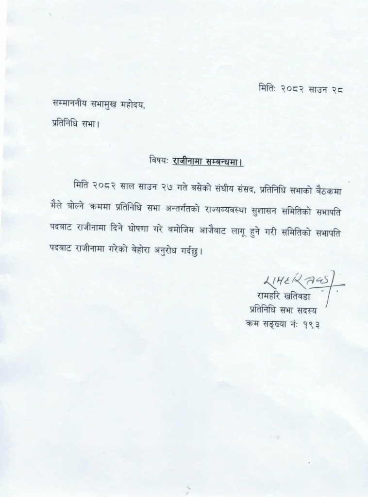 काठमाडौं – नेपाली कांग्रेसका सांसद रामहरि खतिवडाले प्रतिनिधि सभा अन्तर्गतको राज्य व्यवस्था तथा सुशासन समिति सभापति पदबाट राजीनामा दिएका छन्। मंगलबार उनले सभामुख देवराज घिमिरेसमक्ष राजीनामा पत्र बुझाएका हुन्।