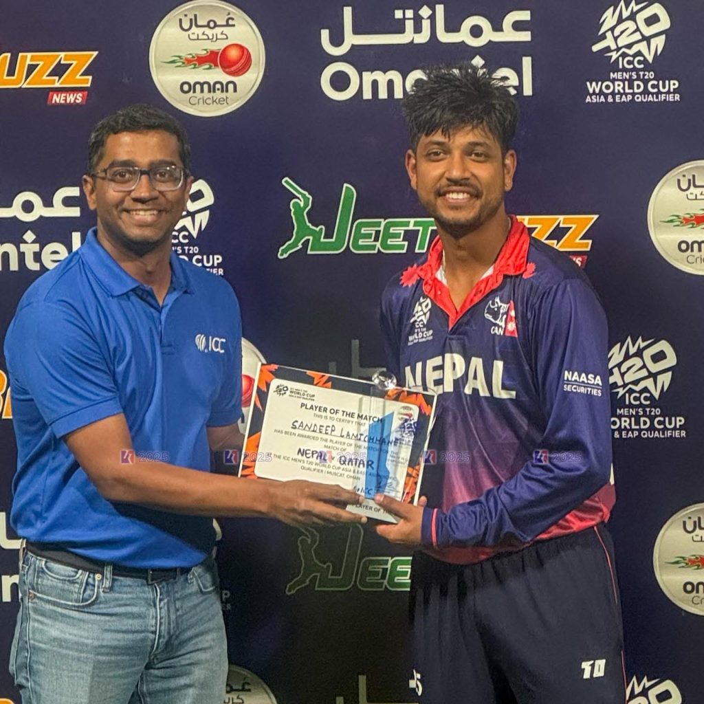 आईसीसी टी–२० विश्वकप एसिया तथा पूर्वी एसिया–प्यासिफिक क्षेत्रीय छनोटको सुपर सिक्स चरणमा नेपालले कतारमाथि विजयी नतिजा निकालेको छ। उक्त खेलमा उत्कृष्ट प्रदर्शन गरेका सन्दीप लामिछानेले पाँच विकेट लिएर ‘प्लेयर अफ द म्याच’ बन्न सफल भए।