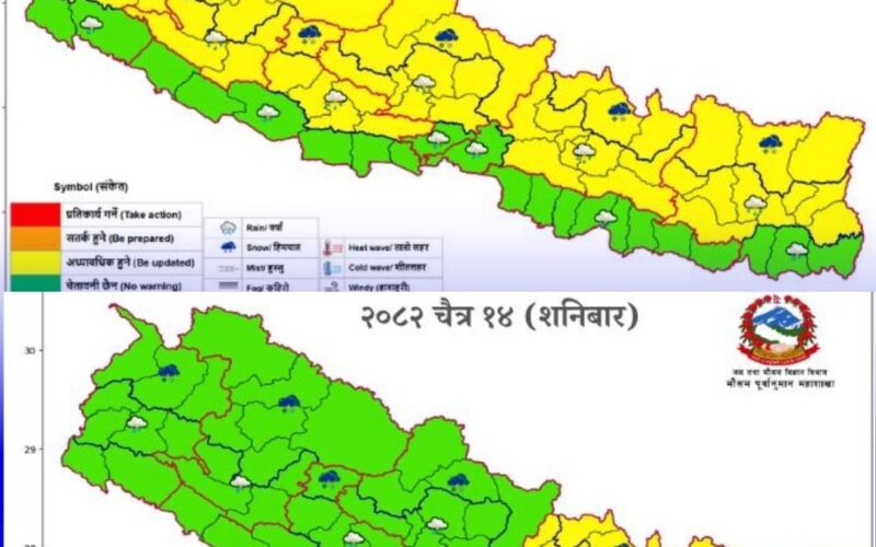 काठमाडौँ – देशभर आगामी दुई दिन मौसम बदली भई विभिन्न स्थानमा मेघगर्जन, चट्याङ, हावाहुरी तथा असिनासहित वर्षा र हिमपातको सम्भावना रहेको मौसम पूर्वानुमान महाशाखाले जनाएको छ।